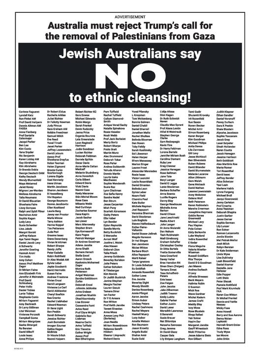 A full-page advertisement proclaiming “Jewish Australians say NO to ethnic cleansing” appeared in today’s Sydney Morning Herald and The Age. Signed by more than 500 Jewish Australians, the advertisement was designed to demonstrate Jewish opposition to the proposal by US President Donald Trump to forcibly transfer Gaza’s two million residents to Egypt and/or Jordan.
